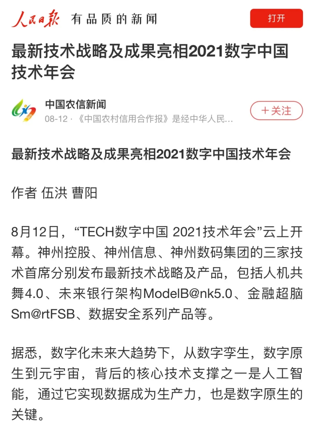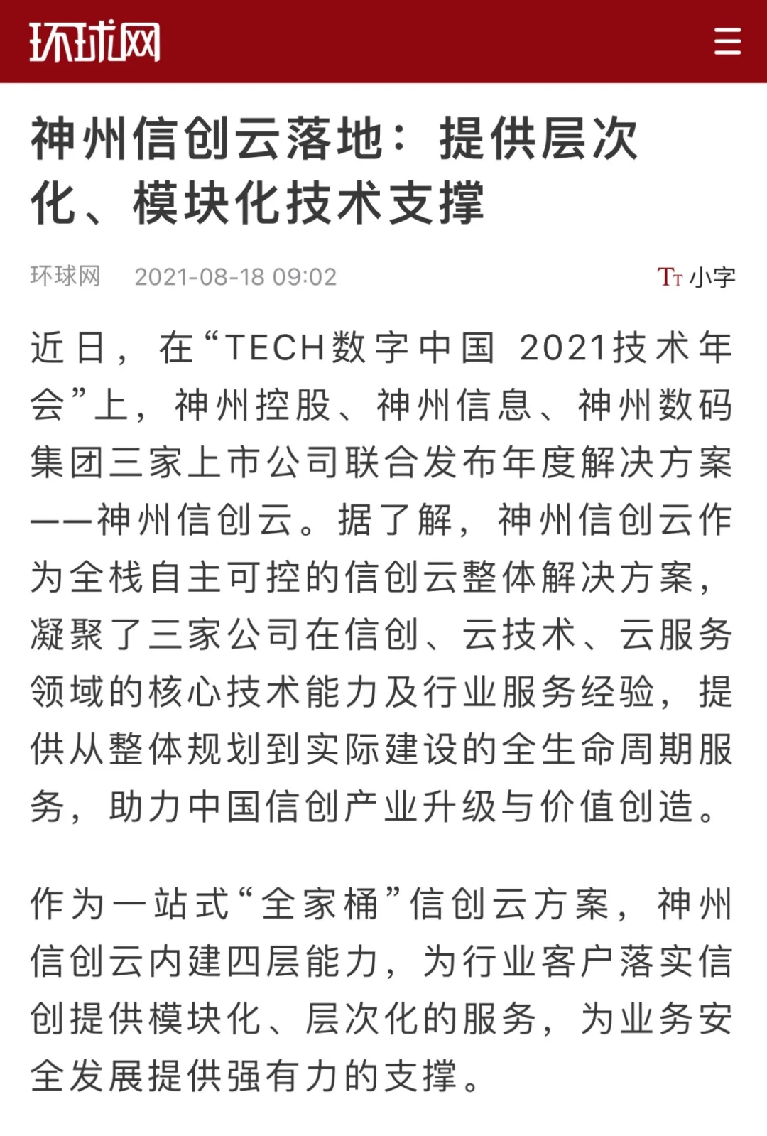 8月12日,由神州控股、神州信息、j9国际站集团联合主办的“科技自强、数据融通、场景创新——TECH数字中国 2021技术年会”云上盛大启幕,发布神州信创云、ModelB@nk5.0、金融超脑Sm@rtFSB、云原生数字化安全底座、园区智能体等重磅产品,国内各大权威、影响力媒体多角度多频次对盛况进行报道!